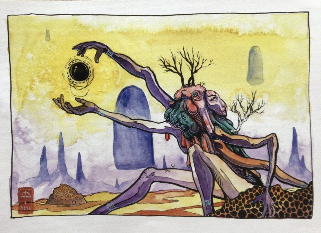 Rajbhandari’s method incorporates REM sleep visualization experiments. His subconsciousness and spirituality are depicted in his pen and ink drawings, which are inspired by automatism and distortion techniques. His work contains recurring themes of masculine and feminine energies, mindfulness, neo-shamanism, neo-tribalism, animism, oneness, and fractals. His older works, on the other hand, portrayed darker aspects of his personality, such as melancholy, fear, grief, discomfort, anger, lust, and doom, as a result of anxiety, inferiority complex, and depression. For him, pursuing art has been a healing and expressive journey. Currently, he is fascinated in working and experimenting with installations and art performance.